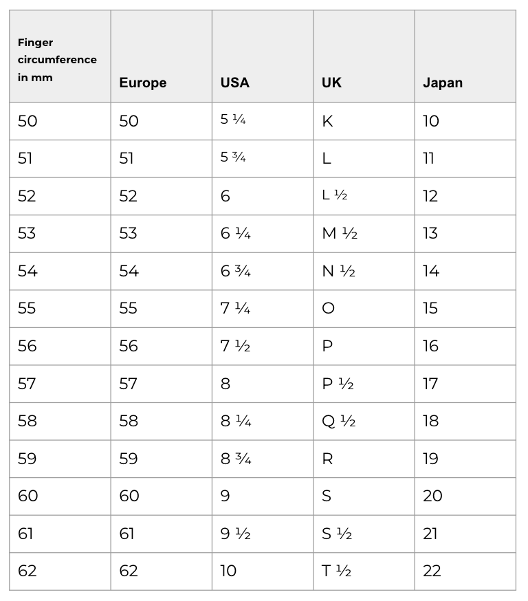 - Finndu stærðina þína: Skoðaðu töfluna til að finna samsvarandi hringastærð.